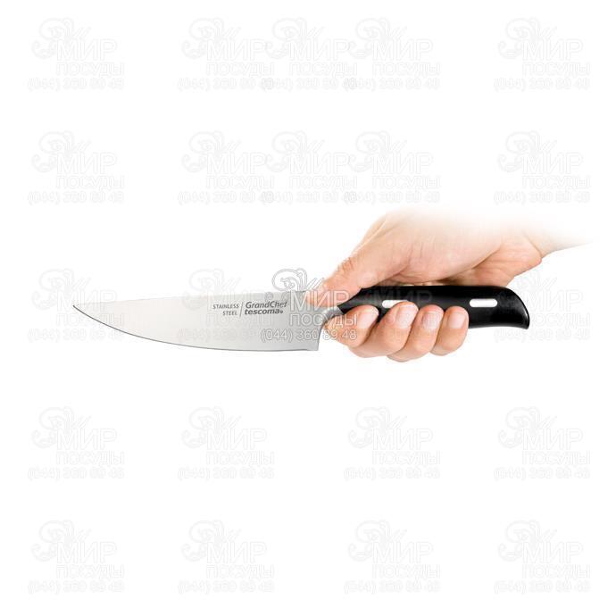 Ніж GrandCHEF від чеського виробника Tescoma викований із високоякісної столової нержавіючої сталі. Рукоятка та лезо ножа стикуються плавно і без виступів – безперервний перехід. Захоплення може бути оптимально адаптоване до їжі, що обробляється. Різка швидка, зручна та безпечна.