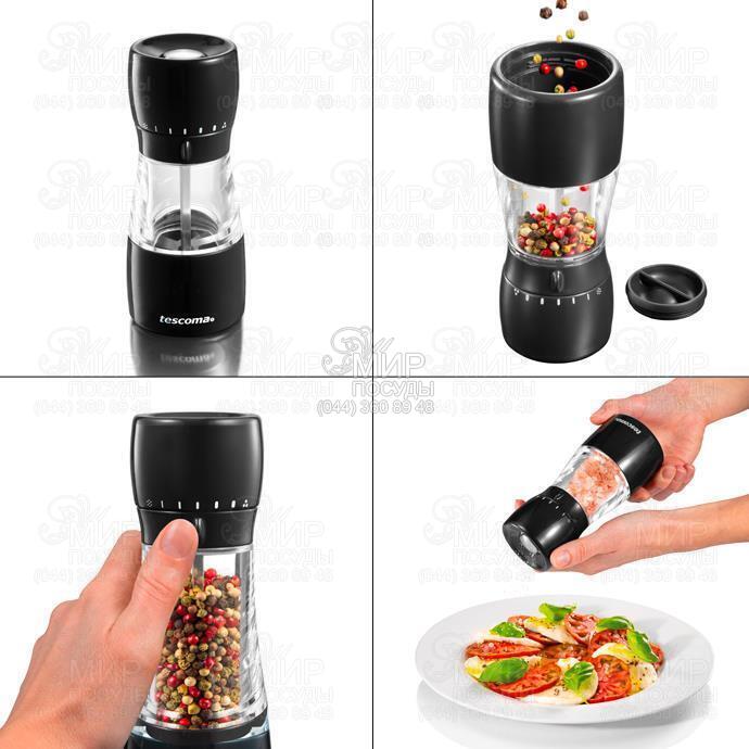 Млин Vitamino від чеського виробника Tescoma чудово підходить для легкої приправи свіжомеленим перцем. Керамічний механізм розміщений у верхній частині млина, перець, що залишився, не падає з млина після використання і стіл залишається чистим. Виготовлена з міцного прозорого акрилу та нержавіючої сталі.
