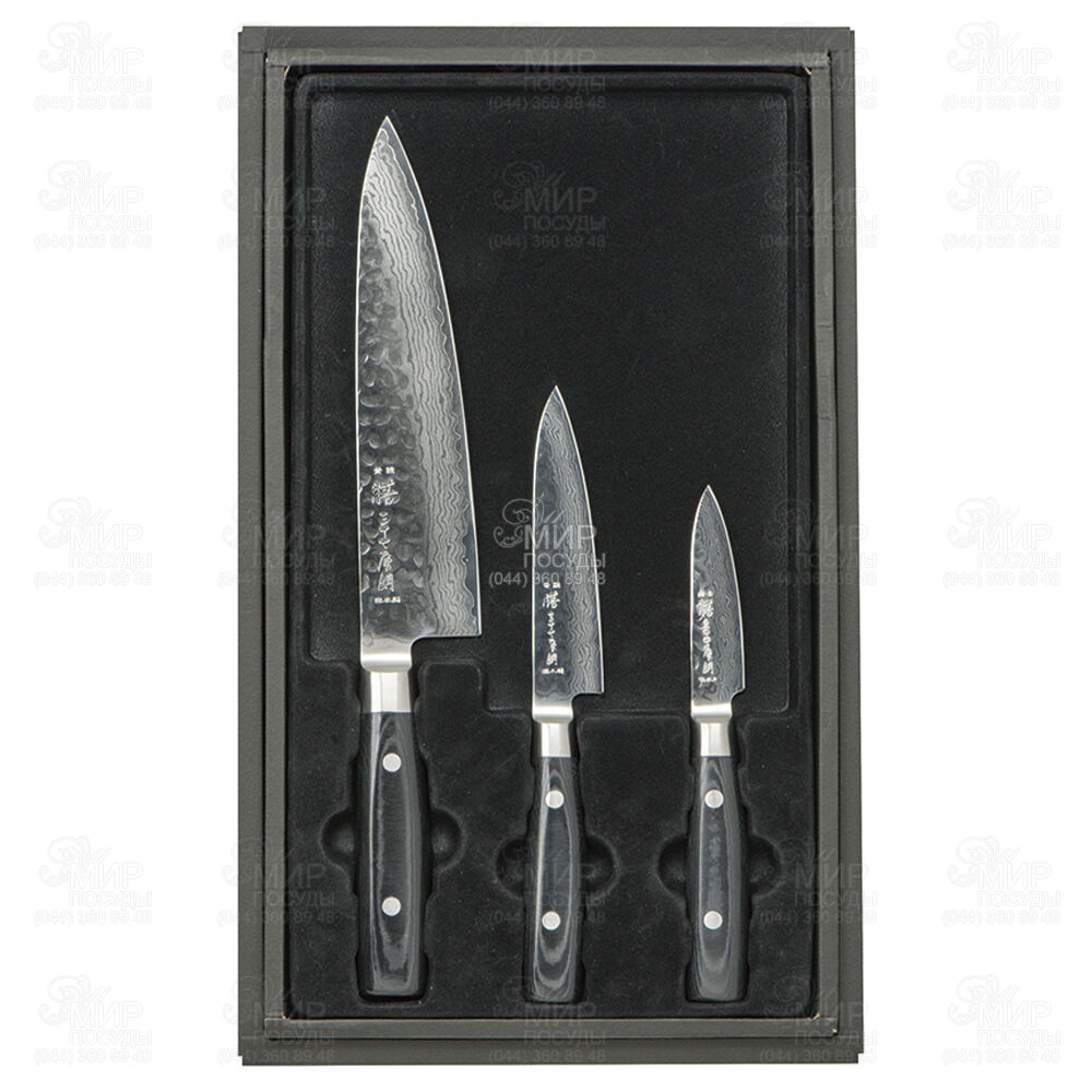 Набір ножів Zen від японського виробника Yaxell виготовлений з дамаської сталі VG10, яка з обох боків закута у високовуглецеву сталь по 18 шарів з кожного боку. В результаті виходить пакет з 37 шарів. Дана модель має чудові ріжучі якості, а загартування сталі до твердості 61HRC по Роквеллу дозволяє довгий час зберігати чудове заточування. Стильне рішення, у вигляді слідів кування у верхній частині клинків, робить ножі надзвичайно красивими та унікальними. Рукоятка виконана з мікарти – надзвичайно міцного матеріалу, який абсолютно не взаємодіє з водою та не насичується запахами продуктів харчування.