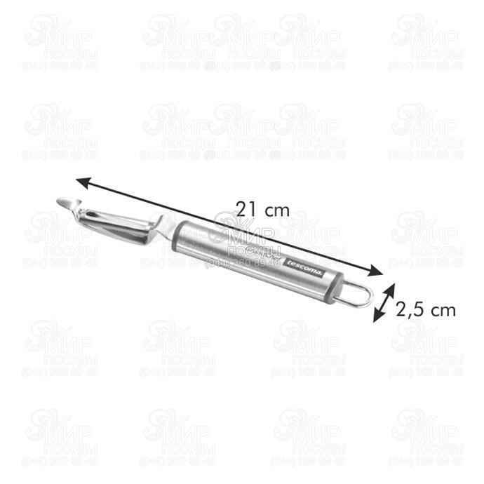 Овочечистка GrandCHEF від чеського виробника Tescoma виготовлена з нержавіючої сталі. Це означає, що виріб прослужить довгий час, а лезо не затупиться. На кінці ручки є спеціальна петля, тому ніж можна зберігати у вертикальному положенні.
