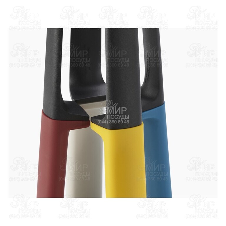 Набір кухонних інструментів Elevate від англійського виробника Joseph Joseph виготовлений із жаростійкого поліпропілену. Укомплектований ложкою шумівкою, лопаткою шумівкою, ложкою кухарською, ополоником. Весь інвентар розташований на зручній круглій підставці. Набір входить у серію кухонних приладів, розроблену для підтримки максимального порядку під час приготування їжі. Спеціальний обтяжувач у рукоятці постійно утримує наконечник навісу, завдяки чому забруднена частина інструменту ніколи не стосується робочої поверхні. Підходить для спільного використання з антипригарним посудом.
