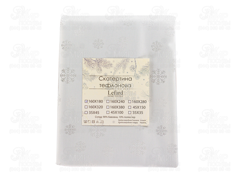 Скатертина від іспанського виробника Lefard Spain виготовлена з поліестеру та бавовни. Ідеально підходить для щоденного домашнього використання, оскільки не потребує особливого догляду. Категорично не допускається застосування відбілювача, пом'якшувача тканини або хімічне чищення. Гладити виріб після прання слід зі зворотного боку.