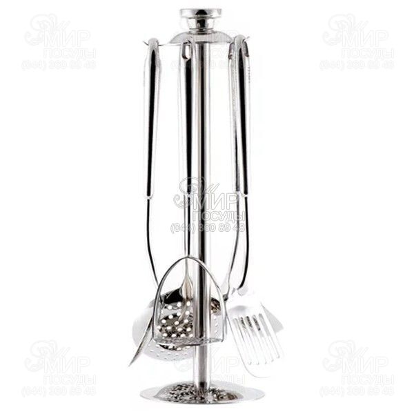 Набір кухонного приладдя від Gipfel зручно розміщено на спеціальній стійці. Прилади виготовлені з нержавіючої сталі із дзеркальним поліруванням. У набір входить - ополоник 37 см, лопатка з прорізами 40 см, шумівка 40 см, ложка 40 см, картопля 35 см. Такий набір відмінно впишеться практично в будь-який інтер'єр.