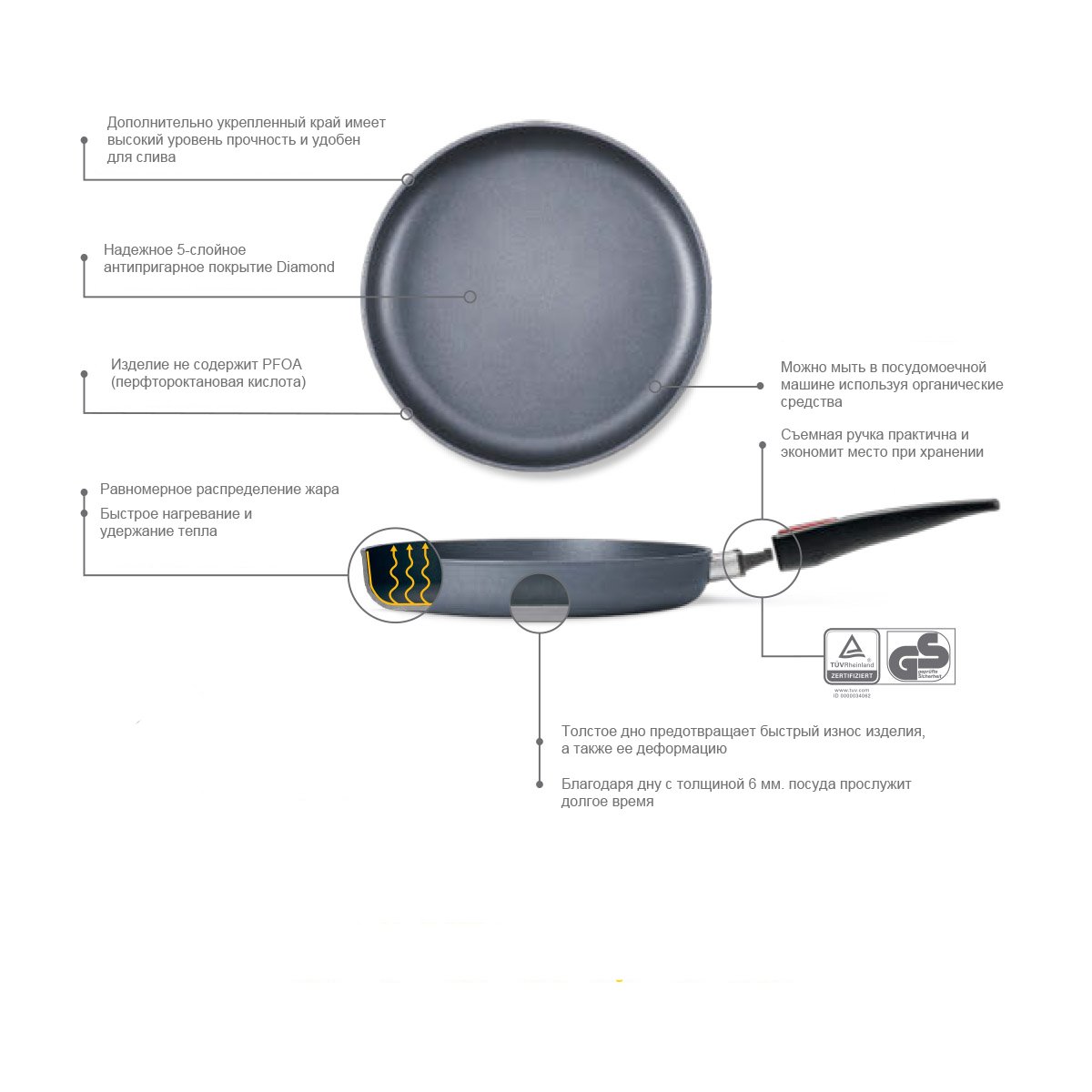 Безпека покриття гарантована навіть при дрібних подряпинах на сковороді. Також не вплинуть вони і на якість смаження.