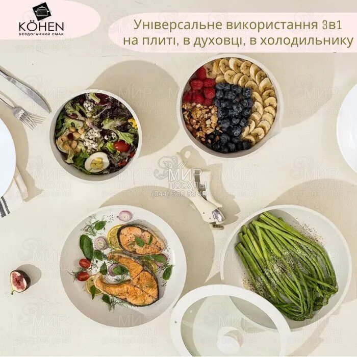 Набір посуду Kohen Optima складається із 5 предметів. Перед першим застосуванням очистіть посуд рідким миючим засобом та теплою водою. Надалі посуд очищається теплою водою, миючим засобом та целюлозною ганчіркою або м'якою стороною губки для миття посуду. Також для чищення посуду можна використовувати м'які щітки. Миття посуду з антипригарним покриттям у посудомийній машині може бути, але не рекомендується.