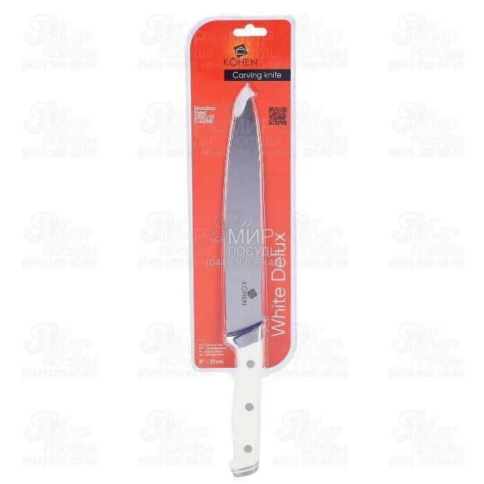 Ніж серії White Deluxe від німецького бренду Kohen виготовлений із мартенситної високовуглецевої сталі марки X30CR13 (1.4028). Це один із найпопулярніших різновидів стали серед світових лідерів з виробництва різальних інструментів та приладів. Їй властиві відмінна корозійна стійкість та легкість у обробці (заточуванні). Кована ручка виконана з нержавіючої сталі та ABS-пластику. Акрилонітрил-бутадієн-стирол або ABS-пластик є термопластичний ударостійкий полімер, який не становить ризику для здоров'я людини і завдяки своїм відмінним характеристикам користується високою популярністю серед виробників кухонних ножів.