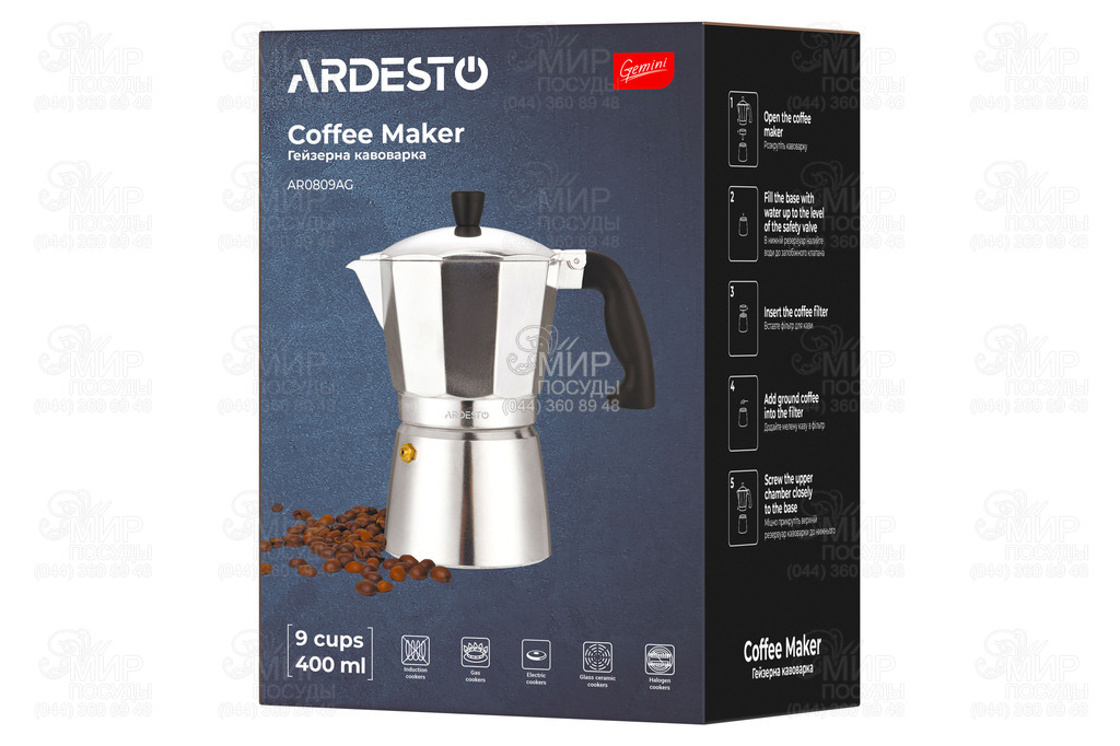 Гейзерна кавоварка Gemini Cremon від Ardesto виготовлена з алюмінію, проте ризик обпалити руки повністю усунуто, адже конструкцією передбачено рукоятку з нейлоновим покриттям. Не рекомендується миття в посудомийній машині.