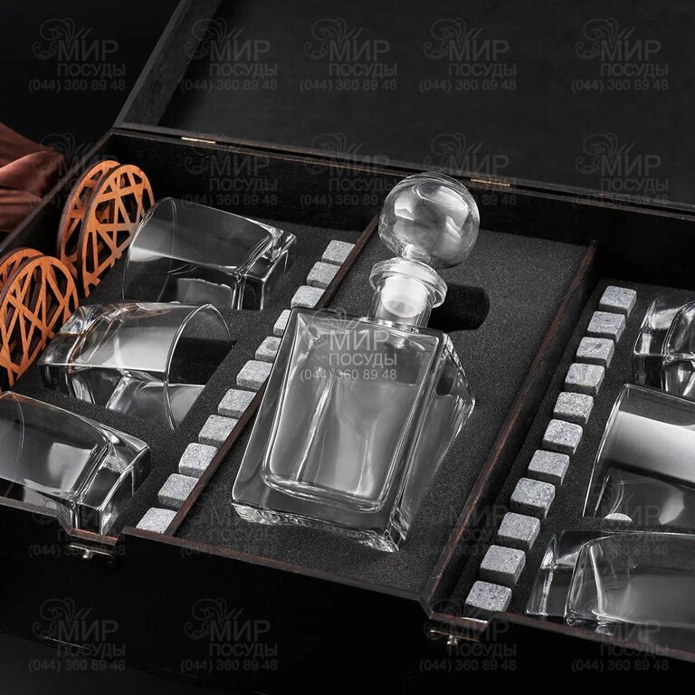Якісне дерев'яне подарункове упакування в темному дереві. Внутрішня частина - це м'який оксамитовий ложемент, на якому розміщено 24 камені, 6 склянок для віскі, графин, 2 мішеча для каменів з екошкіри, щипці та 6 підставок.