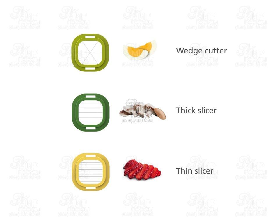 Подрібнювач для овочів 3в1 відмінно підходить для нарізування скибочками або нарізування м'яких продуктів товстими або тонкими скибочками. Ідеально підходить для нарізки варених яєць, м'яких фруктів та грибів.