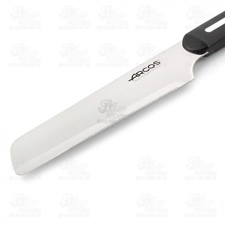 Ніж від іспанського виробника Arcos виготовлений із нержавіючої сталі Nitrum, яка є ексклюзивним винаходом компанії. Вона збагачена азотом і тому довговічна, несприйнятлива до корозії і довго не вимагає заточування. Не менш технологічна рукоятка із поліпропілену. Інноваційний матеріал має дивовижні ударостійкі властивості. Завдяки цьому гострота ножа практично ідеальна, а початкова ріжуча здатність зберігається триваліший час.