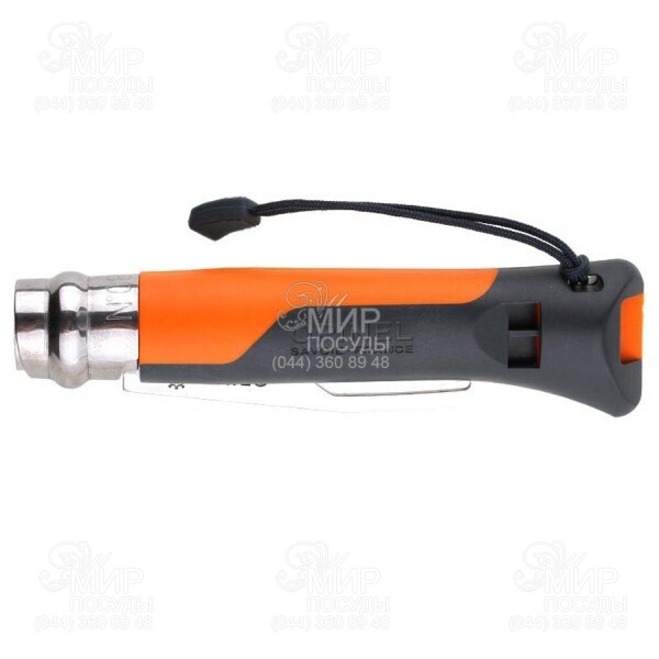 Ніж Opinel №8 Outdoor Orange є одним із туристичних багатофункціональних ножів. Такий ніж можна брати з собою в будь-який похід: чи то полювання, чи рибалка, чи просто відпочинок на березі річки або в лісі. Лезо виготовлене з нержавіючої модифікованої сталі Sandvik 12C27. Лезо забезпечує дуже хороші ріжучі властивості. Ніж оснащений характерною системою блокування Virobloc – вона фіксує меч у відкритому або закритому стані. Через отвір у ручці кріпиться ремінець.