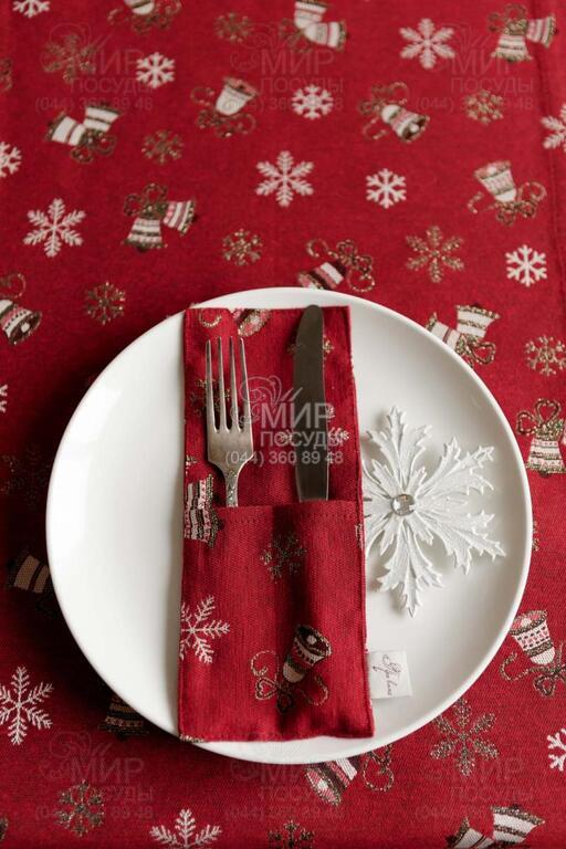 Світ посуду - Домашній інтер'єр - Килимки та серветки для сервірування - Чохол для сервірування столових приборів з люрексом Дзвіночки на червоному 24х10см 4823093467026