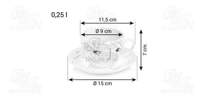 Характеристика: об'єм 250 мл, висота 7 см, діаметр 9 см, діаметр блюдця 15 см