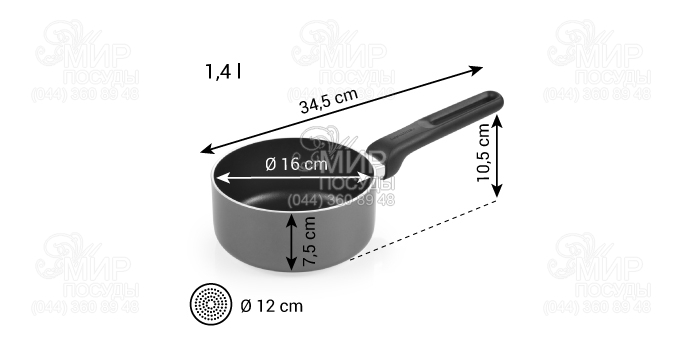 Характеристика: об'єм 1,4 л, діаметр 16 см, діаметр дна 12 см, висота 7,5 см