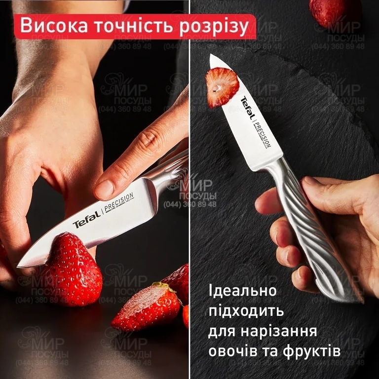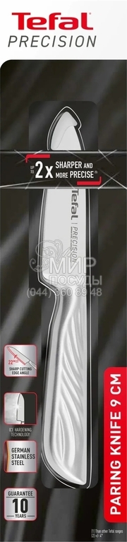 Ніж серії Precision від Tefal настільки гострий, що здатний тонко нарізати будь-які продукти легким рухом леза. Поєднання вишуканого дизайну ручки, що запобігає ковзанню руки, з легкістю самої конструкції приносить задоволення від процесу нарізки. Довговічність, гострота та корозійна стійкість завдяки унікальній технології охолодження леза за температури -120°C.
