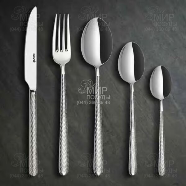 Колекція столових приборів Illusion від турецького бренду Bonna виконана в елегантному, непідвладному часі, стилі. Прилади цієї серії відрізняються від інших тим, що прикрашені класичними смугастими візерунками, відтисненими на всіх предметах. Прибори оснащені рукояткою із округлим наконечником та тонким текстурним патерном на лицьовій стороні. Виконані з високоякісної харчової нержавіючої вуглецевої сталі 18/10 (вміст хрому – 18%, нікелю – 10%) сріблястого відтінку з глянсовою поверхнею та стійкі до подряпин, гарантуючи довговічність та елегантність.