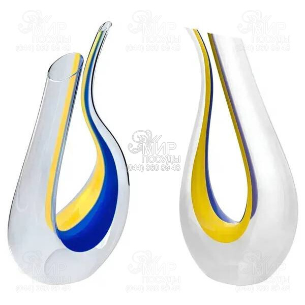 Декантер від австрійського виробника Riedel виготовлений вручну із кришталю. Ексклюзивний декантер вражає не лише своєю скульптурною формою, а й глибоким символізмом. Поєднання насиченого синього та теплого жовтого кольорів асоціюється з національними барвами України, уособлюючи гармонію, силу, свободу та світло. Цей декантер являється не просто винним аксесуаром, а стильним акцентом із символічним змістом. Плавні лінії та динамічний вигин створюють ефект руху, нагадуючи про єдність неба й пшеничного поля — образ, близький кожному українцю. Водночас продумана форма забезпечує ефективну аерацію вина, розкриваючи його аромат і смакові ноти повною мірою.