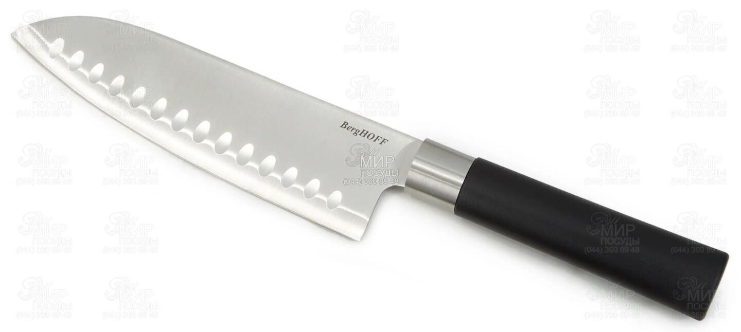 Ніж Сантоку Codon від BergHOFF підходить для подрібнення та нарізування різних видів м'яса, овочів та морепродуктів. Перфорація на лезі не дозволяє продуктам прилипати до ножа. Кована нержавіюча сталь довго зберігає гостре заточування, підходить як для професійного, так і домашнього використання.