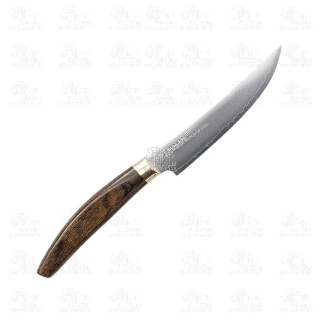 Колекція ножів Elegancia від Suncraft позиціонується як серія преміальних ножів, що створюються з найкращих матеріалів. Рукоятка виготовляється з якісного дерева Пакка насиченого, горіхового кольору, яке разом з характерним латунним болестером покриється з часом патиною, що додасть ножам більш солідного, старовинного вигляду. Крім того, рукоять має характерний вигин, завдяки чому легше лягає в руку, а також нею буде зручно користуватися людям, які мають велику долоню. Леза виробляються із порошкової сталі із сердечником із SG-2, яка є найкращою порошковою нержавіючою сталлю, а також підтримує гостроту леза та кінчика ножа максимально довгий час. Злегка вигнута форма не тільки виглядає оригінально та стильно, але й допомагає спростити процес різання та шаткування овочів та інших продуктів.