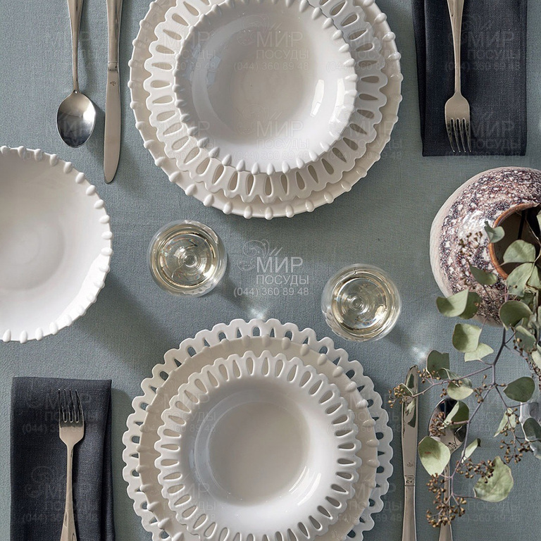 Всі предмети серії Giulietta від італійського виробника La Porcellana Bianca виготовлені з найтоншої білої порцеляни, з делікатним рельєфом, що нагадує мереживо ручної роботи. Кожна деталь цієї колекції займає своє місце на столі як символ елегантності. Витончені обриси, продуманий рельєфний декор і сяюча біла порцеляна втілюють дух класичного італійського романтизму, наповнюючи атмосферу трапези нотками ніжності.