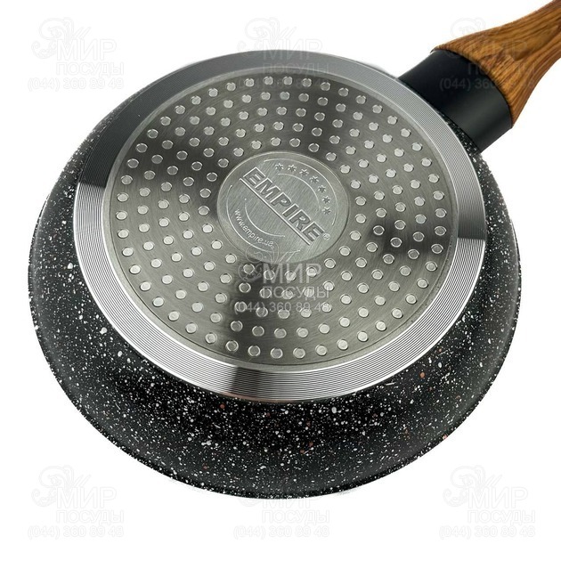Пательня Empire виготовлена із високоякісного алюмінію з мармуровим антипригарним покриттям. Таке покриття запобігає пригоранню та прилипанню, воно безпечне для здоров'я та не виділяє шкідливих речовин під час приготування.