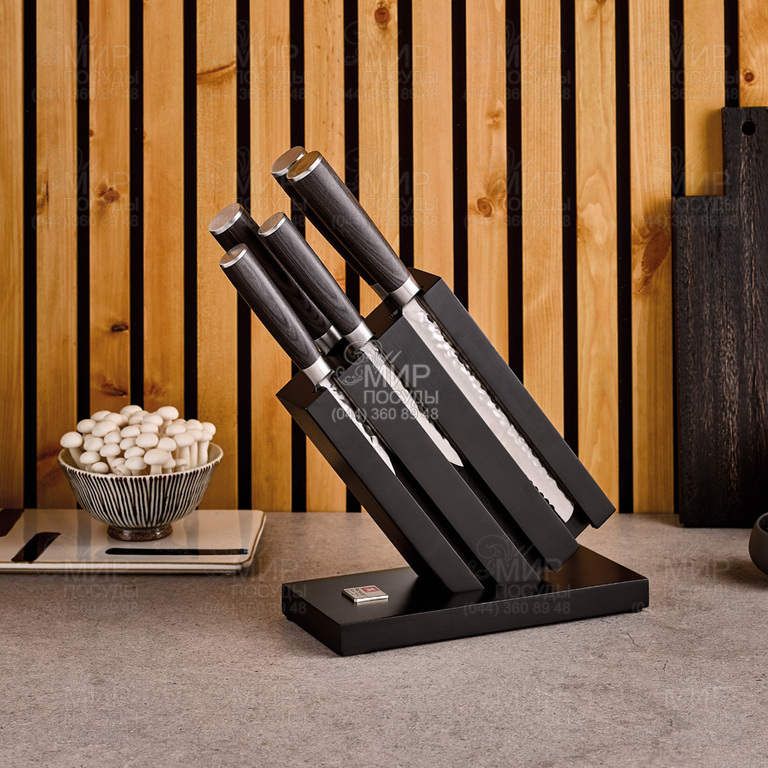 Елегантний набір ножів створений для поціновувачів чистих форм і сучасних інтер'єрних акцентів. Поєднання кованих лез та рукояток з деревини Pakka у японському стилі перетворює набір Uta на виразний та стильний елемент вашої кухні. Леза з високоякісної нержавіючої сталі забезпечують виняткову гостроту і комфорт у приготуванні їжі. Відкрита конструкція підставки та стійка основа не тільки надійно утримують ножі, але й ефектно підкреслюють їхній виразний дизайн.
