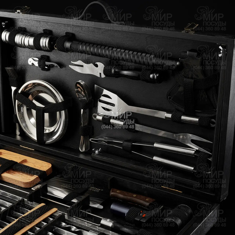 Стильний та функціональний набір для грилю та шашлику в дерев’яному кейсі стане ідеальним вибором для любителів пікніків, барбекю та відпочинку на природі. Усе необхідне для приготування м’яса, овочів чи риби зібрано в одному компактному кейсі. Завдяки зручному розташуванню інструментів Ви завжди матимете порядок та швидкий доступ до потрібного приладдя.