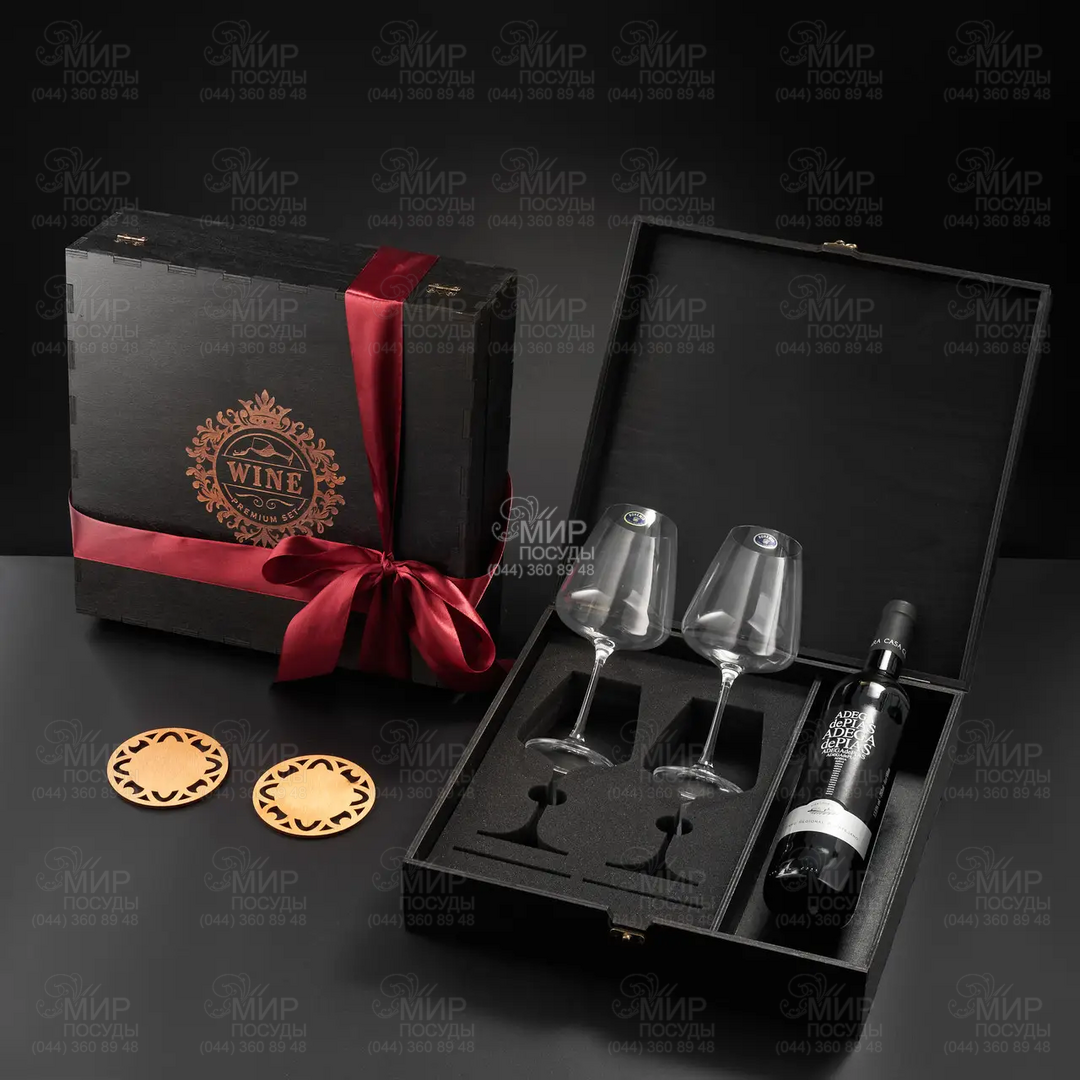 Подарунковий винний набір Bohemia Alca - елегантний вибір для поціновувачів вишуканих напоїв і красивої сервіровки. У комплекті 2 кришталево прозорих келиха класичної форми та 2 дерев’яних підставки під них. Усе упаковане в розкішну дерев’яну коробку з гравіюванням і атласною стрічкою, що робить цей набір ідеальним подарунком для друзів, колег чи близьких. Келихи мають тонкі стінки, гарно розкривають смак та аромат вина, а стильні дерев’яні підставки додають сервіровці вишуканості й захищають поверхню столу. Такий набір стане чудовим доповненням до святкового застілля або романтичного вечора. Також є відсік, у який Ви зможете додати пляшку улюбленого вина (вино в комплект не входить).
