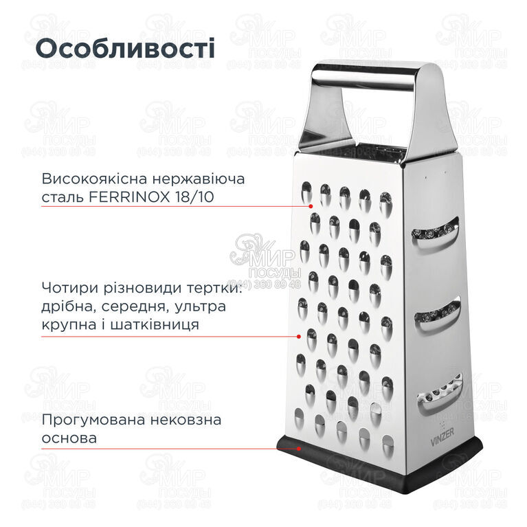 Зручна та проста у використанні тертка з чотирма різними робочими поверхнями стане незамінним аксесуаром на будь-якій кухні. Тертка виготовлена з високоміцної харчової сталі FERRINOX 18/10, яка не деформується з часом, не піддається впливу кислот та лугів, а також корозії. Робочі поверхні виготовлені способом двостороннього хімічного травлення, що забезпечує гостроту для гоління лезам. Нижня частина терки прогумована, що робить її зручною під час роботи.