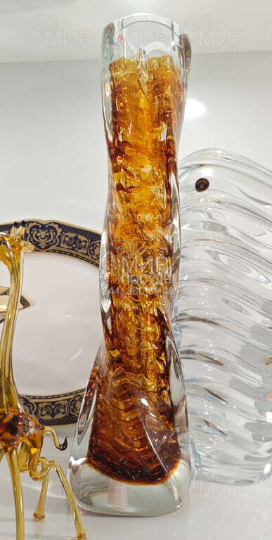 Ваза від чеського виробника виготовлена зі скла. Крім витончено закрученої форми, ваза має чудовий бурштиновий колір, що перетворює виріб на елегантну прикрасу інтер'єру. Товсті стінки вази роблять її масивною, що надає інтер'єру пишності та ошатності.