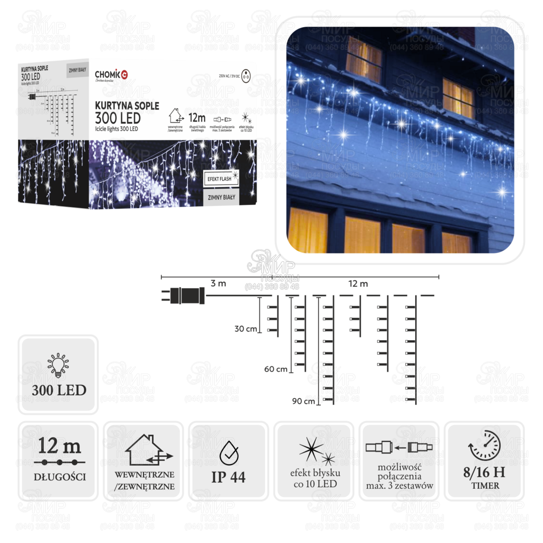 Гірлянда із 300 діодами холодного білого світла. Завдяки розташуванню діодів через кожних 10 сантиметрів вони створюють неймовірно ефектне та затишне свічення, що ідеально підходить для різдвяного декору інтер'єру.