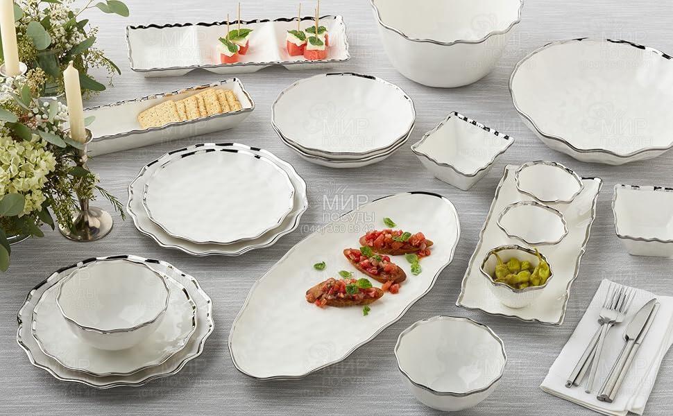 Набір тарілок з колекції Regency Silver від американського бренду Certified International виготовлений із надміцної кераміки та покритий зносостійкою глазур'ю. Вироби прикрашені розписаним вручну платиновим ободом, який додає нотки розкоші до будь-якої страви. Злегка зазубрені краї посуду створюють вишуканий вигляд, який чудово поєднується з іншими предметами серії Regency.