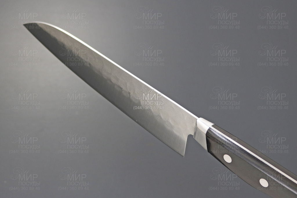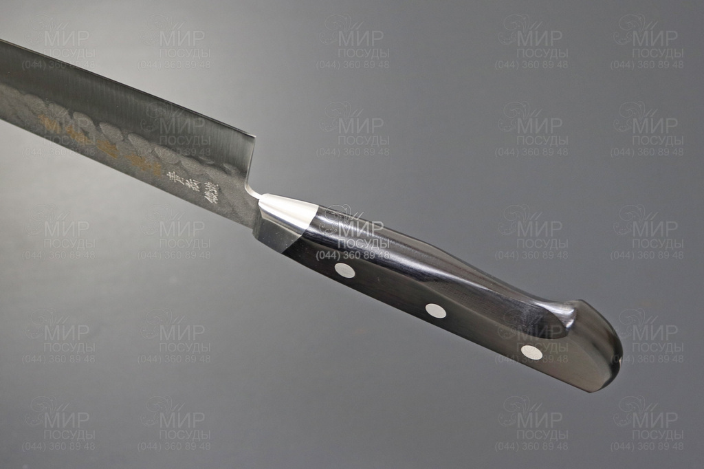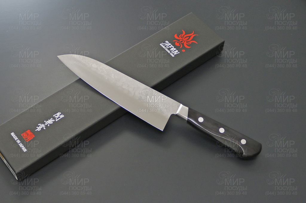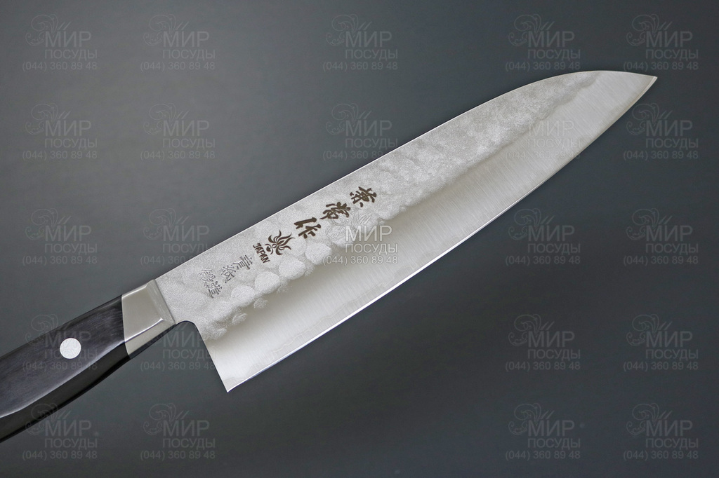 Ніж Сантоку від японського бренду Kanetsune поєднує традиційне мистецтво виготовлення та сучасну ергономіку. Лезо з характерною молотковою текстурою (tsuchime) не тільки виглядає вишукано, а й зменшує прилипання продуктів під час роботи. Зручна ручка з трьома заклепками забезпечує надійний хват, роблячи ніж ідеальним для щоденного використання — від нарізання овочів до тонкого філетування.