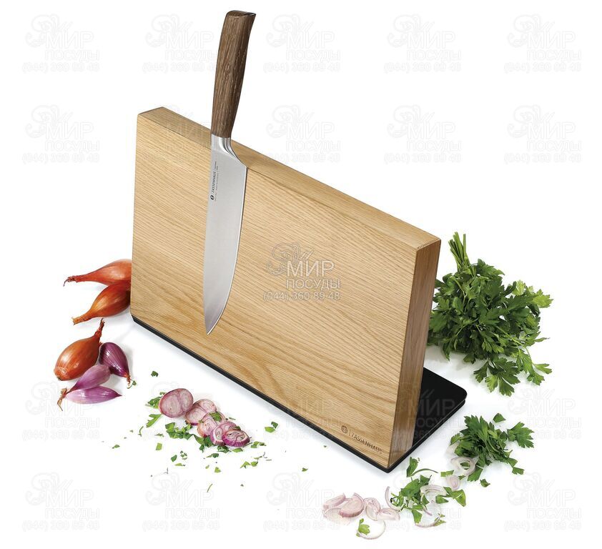 Магнітний блок-тримач для ножів від німецької компанії Zassenhaus виготовлений з дубу. Масив дерева спирається на стійку, що захищає поверхню, основу з нержавіючої сталі. З внутрішньої сторони кожного боку підставки вбудовані міцні магнітні смужки. Вони надійно утримують до восьми ножів із довжиною леза до 23 см. Таким чином, ваш кухарський ніж, ніж для нарізки або ніж для хліба завжди будуть під рукою.