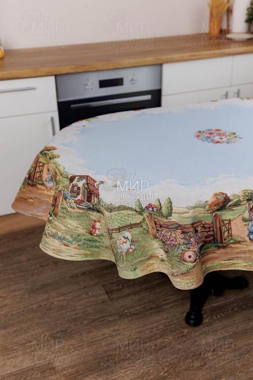 Великодня гобеленова колекція Настрій від українського бренду Прованс — це справжня весняна історія, виткана у тканині. Дизайн наповнений атмосферою затишного сільського пейзажу: зелені галявини, декоративні огорожі, квітучі сади, святкові кошики з писанками та милий великодній кролик створюють відчуття теплої родинної традиції й світлого свята. Панорамний сюжет розміщений уздовж краю виробів, що надає скатертині особливої виразності та робить її центральним акцентом сервірування. Ніжна блакитна основа гармонійно поєднується з пастельними відтінками зеленого, рожевого та кремового, створюючи легкий, свіжий весняний настрій. Гобеленове переплетення забезпечує об’ємність малюнка та глибину кольорів — зображення не нанесене поверхнево, а виткане у структурі тканини. Завдяки цьому вироби відзначаються щільністю, довговічністю та стійкістю до зношування. Колекція ідеально підходить для святкового столу на Великдень та створення сезонного декору в оселі. У серії представлені скатертини, декоративні наволочки та текстильні аксесуари, які легко комбінуються між собою, формуючи завершену композицію.