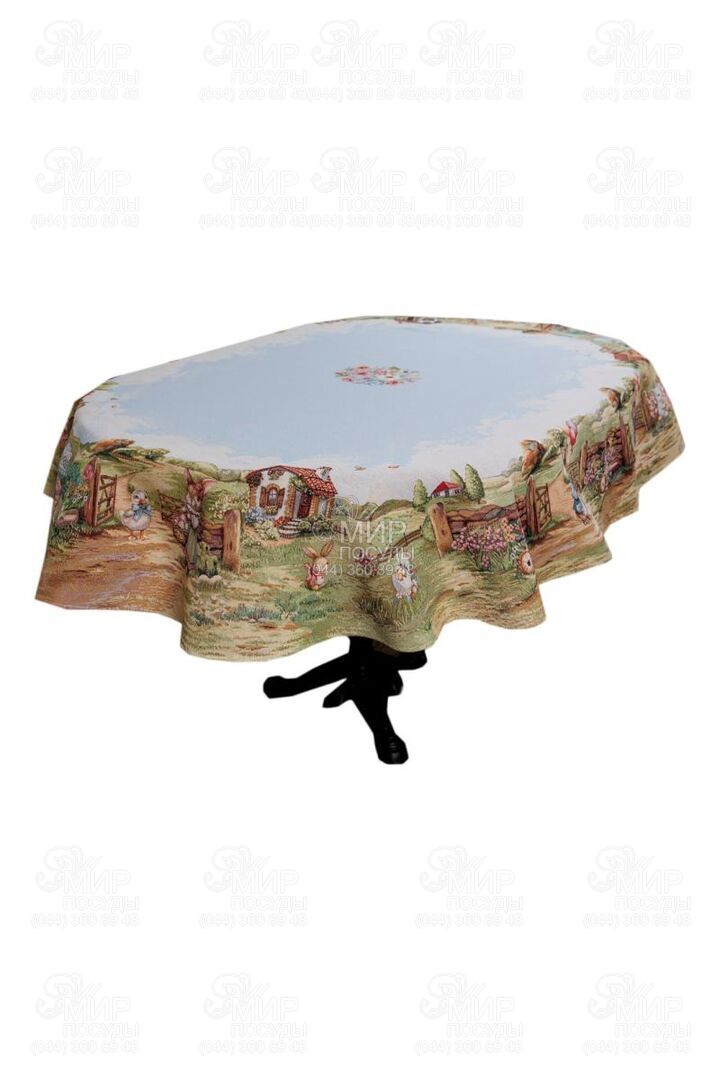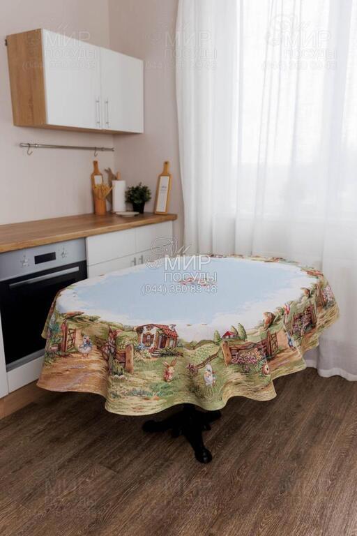 Великодня гобеленова колекція Настрій від українського бренду Прованс — це справжня весняна історія, виткана у тканині. Дизайн наповнений атмосферою затишного сільського пейзажу: зелені галявини, декоративні огорожі, квітучі сади, святкові кошики з писанками та милий великодній кролик створюють відчуття теплої родинної традиції й світлого свята. Панорамний сюжет розміщений уздовж краю виробів, що надає скатертині особливої виразності та робить її центральним акцентом сервірування. Ніжна блакитна основа гармонійно поєднується з пастельними відтінками зеленого, рожевого та кремового, створюючи легкий, свіжий весняний настрій. Гобеленове переплетення забезпечує об’ємність малюнка та глибину кольорів — зображення не нанесене поверхнево, а виткане у структурі тканини. Завдяки цьому вироби відзначаються щільністю, довговічністю та стійкістю до зношування. Колекція ідеально підходить для святкового столу на Великдень та створення сезонного декору в оселі. У серії представлені скатертини, декоративні наволочки та текстильні аксесуари, які легко комбінуються між собою, формуючи завершену композицію.