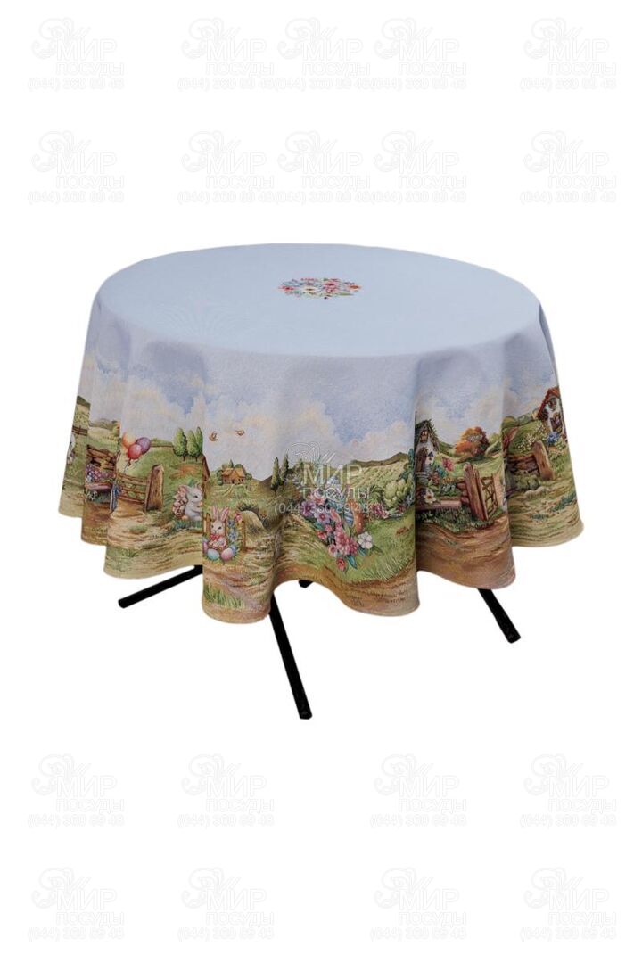Великодня гобеленова колекція Настрій від українського бренду Прованс — це справжня весняна історія, виткана у тканині. Дизайн наповнений атмосферою затишного сільського пейзажу: зелені галявини, декоративні огорожі, квітучі сади, святкові кошики з писанками та милий великодній кролик створюють відчуття теплої родинної традиції й світлого свята. Панорамний сюжет розміщений уздовж краю виробів, що надає скатертині особливої виразності та робить її центральним акцентом сервірування. Ніжна блакитна основа гармонійно поєднується з пастельними відтінками зеленого, рожевого та кремового, створюючи легкий, свіжий весняний настрій. Гобеленове переплетення забезпечує об’ємність малюнка та глибину кольорів — зображення не нанесене поверхнево, а виткане у структурі тканини. Завдяки цьому вироби відзначаються щільністю, довговічністю та стійкістю до зношування. Колекція ідеально підходить для святкового столу на Великдень та створення сезонного декору в оселі. У серії представлені скатертини, декоративні наволочки та текстильні аксесуари, які легко комбінуються між собою, формуючи завершену композицію.