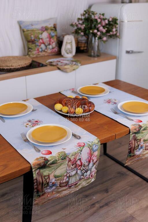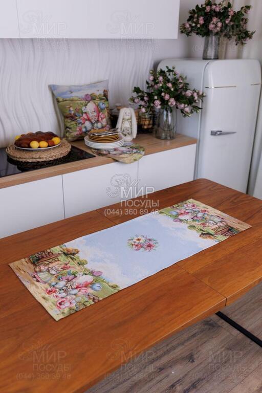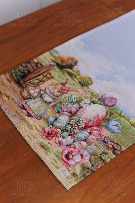 Великодня гобеленова колекція Настрій від українського бренду Прованс — це справжня весняна історія, виткана у тканині. Дизайн наповнений атмосферою затишного сільського пейзажу: зелені галявини, декоративні огорожі, квітучі сади, святкові кошики з писанками та милий великодній кролик створюють відчуття теплої родинної традиції й світлого свята. Панорамний сюжет розміщений уздовж краю виробів, що надає скатертині особливої виразності та робить її центральним акцентом сервірування. Ніжна блакитна основа гармонійно поєднується з пастельними відтінками зеленого, рожевого та кремового, створюючи легкий, свіжий весняний настрій. Гобеленове переплетення забезпечує об’ємність малюнка та глибину кольорів — зображення не нанесене поверхнево, а виткане у структурі тканини. Завдяки цьому вироби відзначаються щільністю, довговічністю та стійкістю до зношування. Колекція ідеально підходить для святкового столу на Великдень та створення сезонного декору в оселі. У серії представлені скатертини, декоративні наволочки та текстильні аксесуари, які легко комбінуються між собою, формуючи завершену композицію.