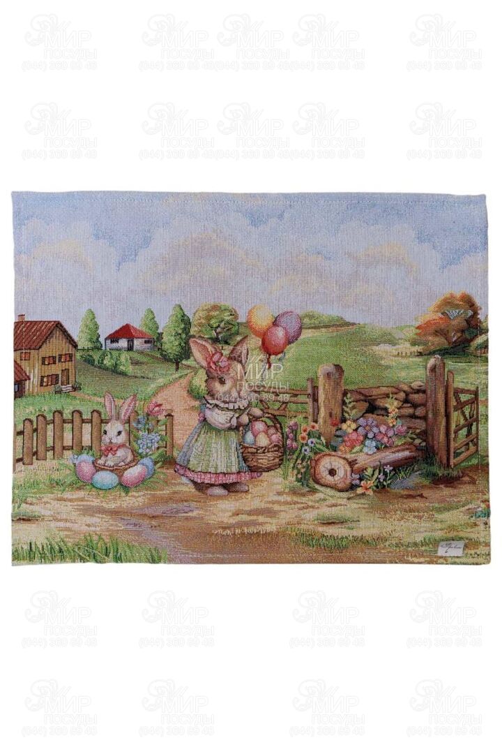 Великодня гобеленова колекція Настрій від українського бренду Прованс — це справжня весняна історія, виткана у тканині. Дизайн наповнений атмосферою затишного сільського пейзажу: зелені галявини, декоративні огорожі, квітучі сади, святкові кошики з писанками та милий великодній кролик створюють відчуття теплої родинної традиції й світлого свята. Панорамний сюжет розміщений уздовж краю виробів, що надає скатертині особливої виразності та робить її центральним акцентом сервірування. Ніжна блакитна основа гармонійно поєднується з пастельними відтінками зеленого, рожевого та кремового, створюючи легкий, свіжий весняний настрій. Гобеленове переплетення забезпечує об’ємність малюнка та глибину кольорів — зображення не нанесене поверхнево, а виткане у структурі тканини. Завдяки цьому вироби відзначаються щільністю, довговічністю та стійкістю до зношування. Колекція ідеально підходить для святкового столу на Великдень та створення сезонного декору в оселі. У серії представлені скатертини, декоративні наволочки та текстильні аксесуари, які легко комбінуються між собою, формуючи завершену композицію.