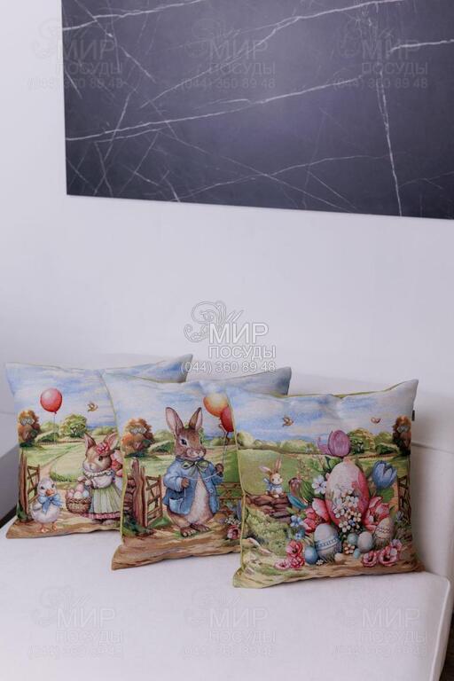 Великодня гобеленова колекція Настрій від українського бренду Прованс — це справжня весняна історія, виткана у тканині. Дизайн наповнений атмосферою затишного сільського пейзажу: зелені галявини, декоративні огорожі, квітучі сади, святкові кошики з писанками та милий великодній кролик створюють відчуття теплої родинної традиції й світлого свята. Панорамний сюжет розміщений уздовж краю виробів, що надає скатертині особливої виразності та робить її центральним акцентом сервірування. Ніжна блакитна основа гармонійно поєднується з пастельними відтінками зеленого, рожевого та кремового, створюючи легкий, свіжий весняний настрій. Гобеленове переплетення забезпечує об’ємність малюнка та глибину кольорів — зображення не нанесене поверхнево, а виткане у структурі тканини. Завдяки цьому вироби відзначаються щільністю, довговічністю та стійкістю до зношування. Колекція ідеально підходить для святкового столу на Великдень та створення сезонного декору в оселі. У серії представлені скатертини, декоративні наволочки та текстильні аксесуари, які легко комбінуються між собою, формуючи завершену композицію.