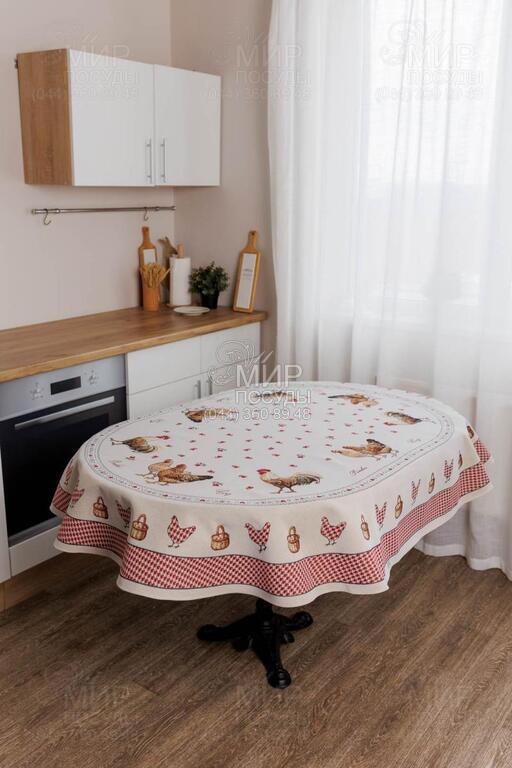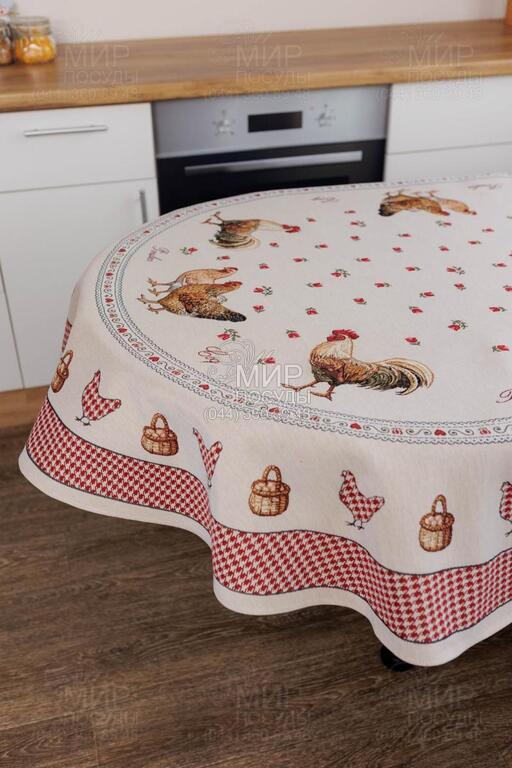 Колекція гобеленового текстилю Добробут від українського бренду Прованс з колоритним півником наповнює кухню атмосферою тепла, ароматом свіжої випічки та відчуттям справжнього домашнього затишку. Дизайн натхненний фермерською тематикою: виразні зображення півня та курочки, дрібний орнамент у клітинку, декоративні бордюри й тепла червоно-молочна гама створюють атмосферу домашнього тепла та гастрономічного затишку. Центральні композиції гармонійно доповнюються орнаментальними рамками й дрібними тематичними деталями, завдяки чому кожен виріб виглядає завершеним та декоративно насиченим. Насичений червоний колір додає акценту, роблячи текстиль яскравим елементом кухонного інтер’єру. Гобеленове переплетення формує об’ємний, глибокий малюнок, який не наноситься поверх тканини, а витканий у її структурі. Завдяки цьому вироби відзначаються щільністю, довговічністю та стійкістю до зношування, зберігаючи форму й колір навіть при активному використанні. У серії представлені скатертини, серветки, декоративні наволочки, прихватки, доріжки та кухонні аксесуари, які легко комбінуються між собою, створюючи цілісний ансамбль у стилі кантрі або прованс.