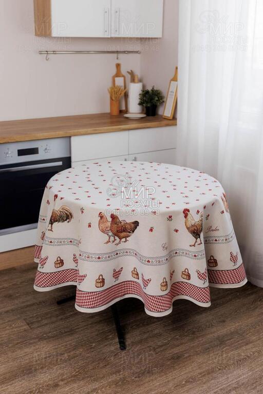 Колекція гобеленового текстилю Добробут від українського бренду Прованс з колоритним півником наповнює кухню атмосферою тепла, ароматом свіжої випічки та відчуттям справжнього домашнього затишку. Дизайн натхненний фермерською тематикою: виразні зображення півня та курочки, дрібний орнамент у клітинку, декоративні бордюри й тепла червоно-молочна гама створюють атмосферу домашнього тепла та гастрономічного затишку. Центральні композиції гармонійно доповнюються орнаментальними рамками й дрібними тематичними деталями, завдяки чому кожен виріб виглядає завершеним та декоративно насиченим. Насичений червоний колір додає акценту, роблячи текстиль яскравим елементом кухонного інтер’єру. Гобеленове переплетення формує об’ємний, глибокий малюнок, який не наноситься поверх тканини, а витканий у її структурі. Завдяки цьому вироби відзначаються щільністю, довговічністю та стійкістю до зношування, зберігаючи форму й колір навіть при активному використанні. У серії представлені скатертини, серветки, декоративні наволочки, прихватки, доріжки та кухонні аксесуари, які легко комбінуються між собою, створюючи цілісний ансамбль у стилі кантрі або прованс.