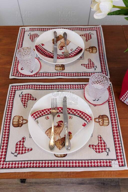 Колекція гобеленового текстилю Добробут від українського бренду Прованс з колоритним півником наповнює кухню атмосферою тепла, ароматом свіжої випічки та відчуттям справжнього домашнього затишку. Дизайн натхненний фермерською тематикою: виразні зображення півня та курочки, дрібний орнамент у клітинку, декоративні бордюри й тепла червоно-молочна гама створюють атмосферу домашнього тепла та гастрономічного затишку. Центральні композиції гармонійно доповнюються орнаментальними рамками й дрібними тематичними деталями, завдяки чому кожен виріб виглядає завершеним та декоративно насиченим. Насичений червоний колір додає акценту, роблячи текстиль яскравим елементом кухонного інтер’єру. Гобеленове переплетення формує об’ємний, глибокий малюнок, який не наноситься поверх тканини, а витканий у її структурі. Завдяки цьому вироби відзначаються щільністю, довговічністю та стійкістю до зношування, зберігаючи форму й колір навіть при активному використанні. У серії представлені скатертини, серветки, декоративні наволочки, прихватки, доріжки та кухонні аксесуари, які легко комбінуються між собою, створюючи цілісний ансамбль у стилі кантрі або прованс.
