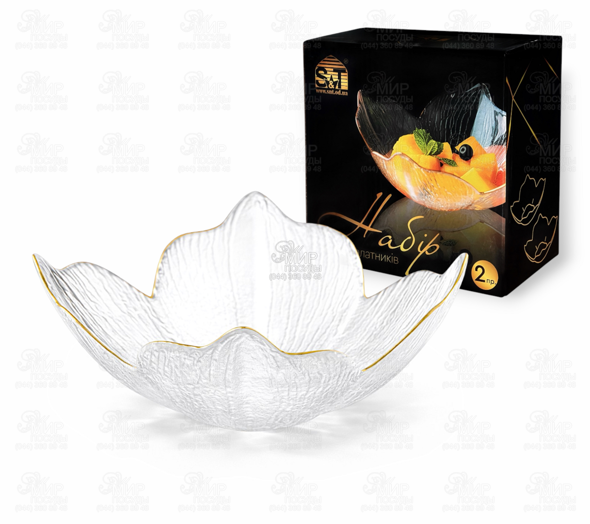 Посуд від українського бренду S&T – це втілення витонченої елегантності та сучасної розкоші. Вироби виконані з фактурного прозорого скла, а особливий шарм надає вишукана окантовка золотистого кольору, яка підкреслює форму посуду та надає сервіруванню святкового та преміального вигляду.