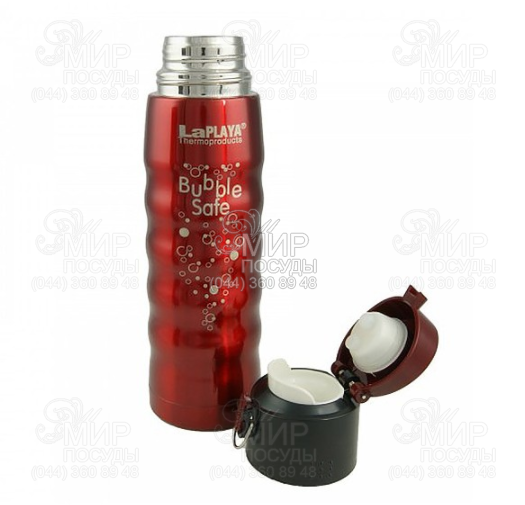 Термопляшка LaPLAYA Bubble Safe (0,5л) від бренду LaPLAYA (Німеччина). Корпус виготовлений із легкої високоякісної нержавіючої сталі 18/10 із двома стінками, із вакуумною системою збереження гарячого чи холодного. Термопляшка оснащена пластиковою гвинтовою пробкою із вбудованим гігієнічним клапаном для пиття прямо з ємності. Для цінителів активного способу життя передбачена стартова кнопка, з'єднана з кришкою, що відкидається, що дозволяє користуватися термопляшкою однією рукою. Всі місця з'єднання пробки, клапана та коруса абсолютно герметичні, пляшку можна перевертати, трясти – ваш улюблений чай/газований напій/сік не тільки збереже свою температуру, але й не проллється. Усі частини термопляшки легко розбираються, миються та збираються знову. Час збереження холодних напоїв – 12 год., гарячих – 6 год.