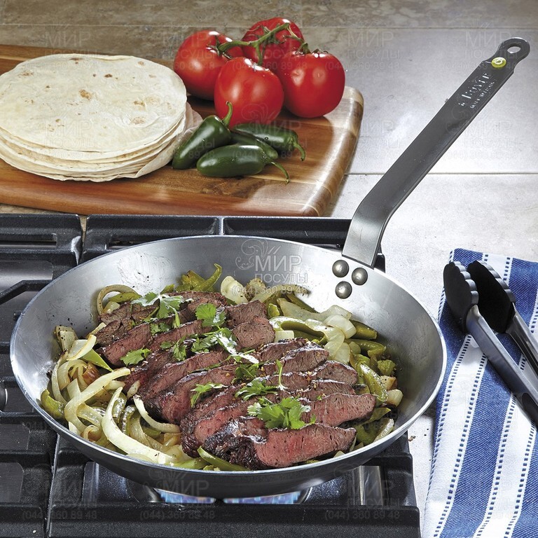 в процесі використання темніє і набуває антипригарних якостей, чим темніше сковорода, тим краще природні антипригарні властивості.