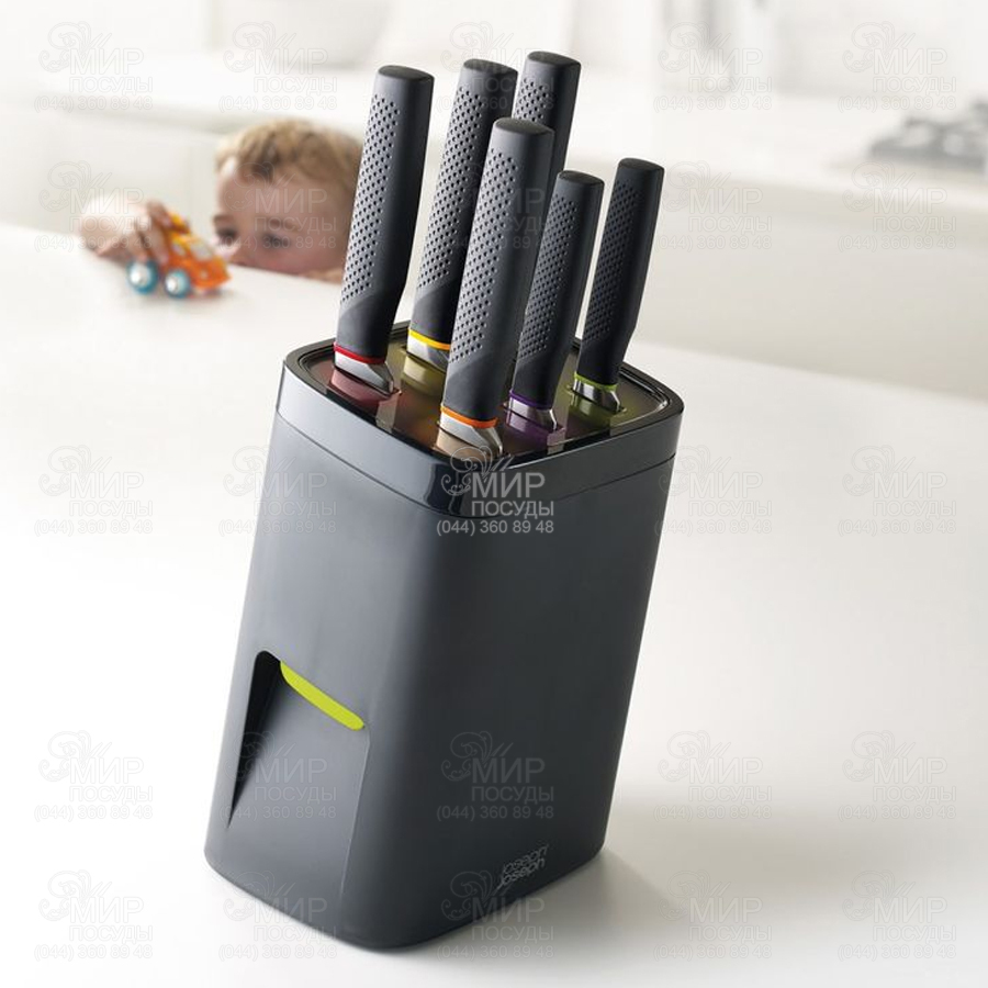У всіх кухонних ножах головним залишається безпека. Особливо, якщо у Вас вдома маленькі діти! Ножі, що лежать у ящику столу, легко доступні і можуть поранити Вас, а ще гірше можуть затупитися при терті один про одного. Усі проблеми вирішить спеціальна підставка із системою автоблокування.