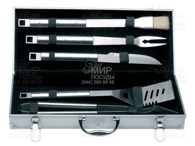 Набір для гриля містить найнеобхідніші предмети, які знадобляться на пікніку. Ідеально підходять для домашнього та професійного приготування. Прилади виготовлені з високоякісної нержавіючої сталі, міцного та не схильного до корозії матеріалу, що забезпечує тривалий термін служби. Матова поверхня має гігієнічну, її легко чистити. Ергономічні ручки забезпечують безпеку та зручність роботи.