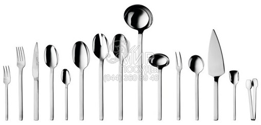 Набір виготовлений із високоякісної нержавіючої сталі 18/10. Набір включає всі необхідні пристрої, включаючи десертну вилку. Прямі ручки та строга форма - відмінна риса даного набору. Підходить для посудомийної машини.