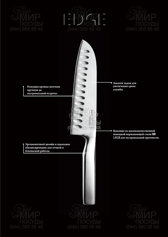 Посуд від німецького виробника посуду Woll – це продукт високої якості топ-класу. Ножі із серії Edge виготовлені з високовуглецевої хромової сталі крижаного гарту з додаванням молібдену та ванадія - X50CrMoV15. Завдяки оптимальному складу ножі, виготовлені з такої сталі довго тримають заточування, не змінюють свого кольору, менше схильні до окислення, з часом не втрачають міцність. Ножі серії Edge ідеально підходять для активного використання, зберігаючи якості та зовнішній вигляд незмінними тривалий час. Також ножі даної серії мають ергономічний дизайн і ідеально збалансовані для зручності використання. Ручне заточування забезпечує тривалу гостроту ріжучої поверхні. Універсальний ніж – незамінний помічник на кухні, який дозволить швидко почистити овочі, нарізати продукти на тонкі скибочки, видалити серцевину з яблук, нашаткувати зелень.